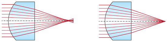 圖1: 帶有球差的球透鏡,以及幾乎沒有任何球差的非球面透鏡