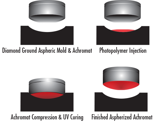 混合成型,以如消色差透鏡的一個標(biāo)準(zhǔn)球面表面為基底,通過包含了一薄層光敏聚合物的非球面模造,將該球面表面壓鑄成型,*終生產(chǎn)出一個非球面表面。這項技術(shù)采用一個鉆石磨砂非球面模造和一個玻璃消色差透鏡(雖然也可以使用其他類型的單片透鏡和雙合透鏡),在非球面模造內(nèi)注入光敏聚合物,再讓非球面模造將球面表面壓鑄成型。*后,此技術(shù)通過在室溫壓縮和UV固化這兩個表面,產(chǎn)生一個非球面消色差透鏡。該透鏡的光學(xué)屬性結(jié)合了其所組成部件分別所展示的光學(xué)屬性:消色和球面像差校正。圖7為混合透鏡的制作過程。混合成型非常適用于高批量高精密的應(yīng)用,這些場合除了需要極高性能之外,也可以通過批量生產(chǎn)所獲得的成本節(jié)約抵消其高初始工具成本。更多有關(guān)使用混合流程制作非球面消色差透鏡的信息,請參閱為什么使用消色差透鏡?。