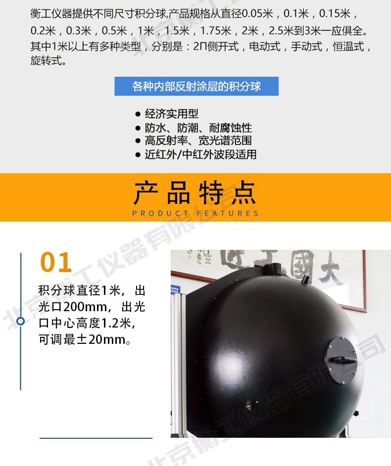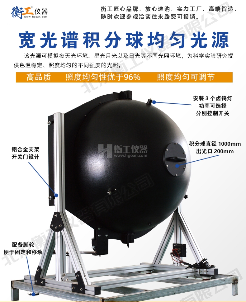 1、積分球直徑1米,出光口200mm,出光口中心高度1.2米,可調(diào)最±20mm。