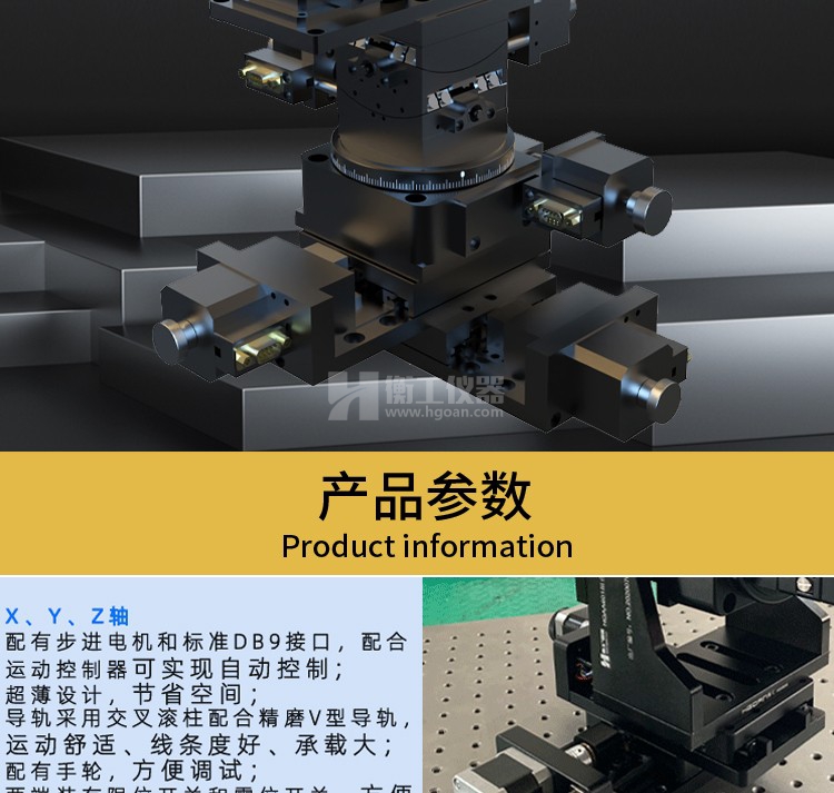 六維電控位移臺具有三維平移,三維旋轉共六維電動調整,三維平移行程:30mm,水平X軸旋轉調整角度:360°,水平Y軸旋轉調整角度:±15°,垂直Z軸旋轉調整角度±10°。