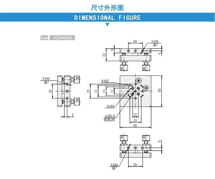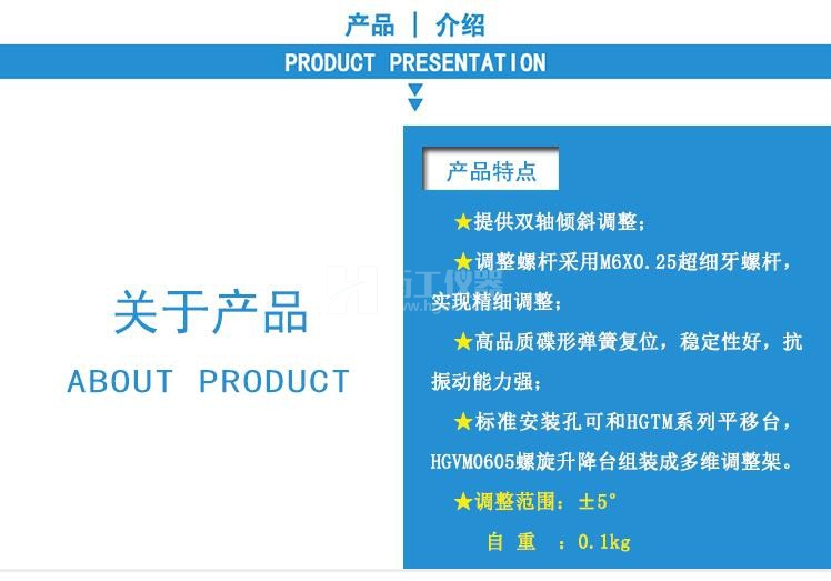 本產(chǎn)品提供雙軸傾斜調(diào)整,調(diào)整螺桿采用M6*0.25超細(xì)牙螺桿實(shí)現(xiàn)精細(xì)調(diào)整;高品質(zhì)蝶形彈簧復(fù)位,穩(wěn)定性好,抗振動(dòng)能力強(qiáng);標(biāo)準(zhǔn)安裝孔可和HGTM系列平移臺(tái)HGVM0605螺旋升降臺(tái)組成多維調(diào)整架。