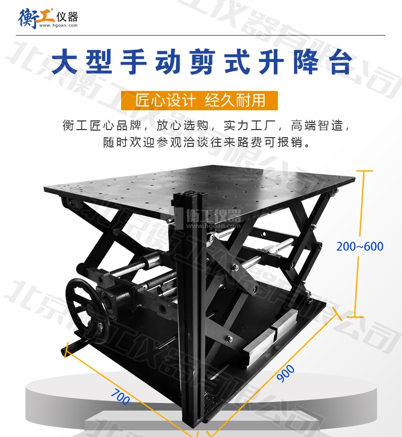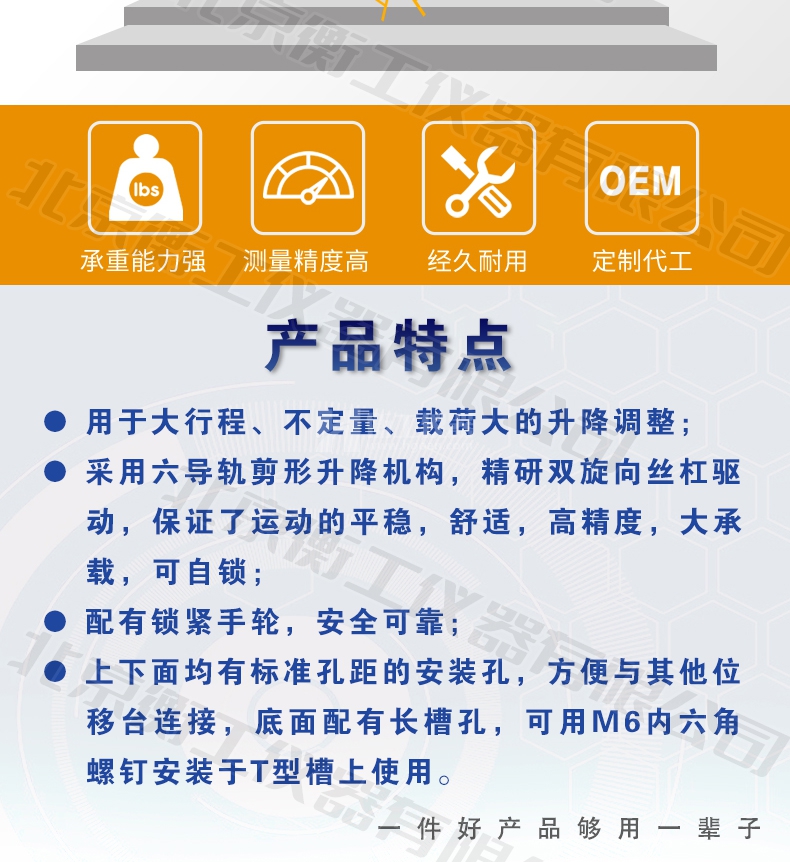 采用大行程、不定量、載荷大的升降調(diào)整;采用六導(dǎo)軌剪形升降機(jī)構(gòu),運(yùn)動平穩(wěn),高精度,可自鎖,安全可靠。