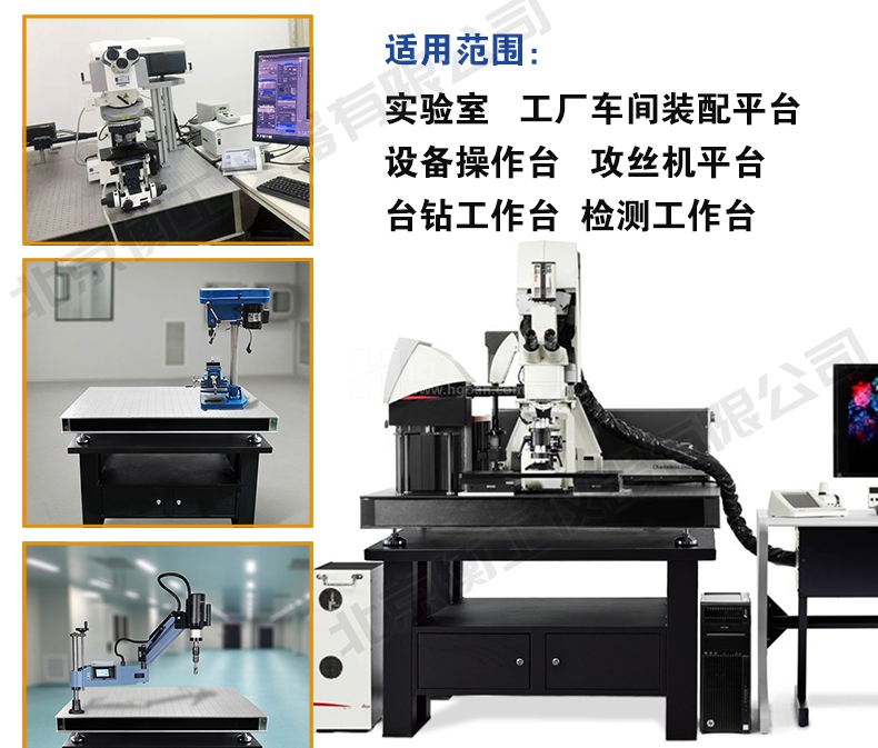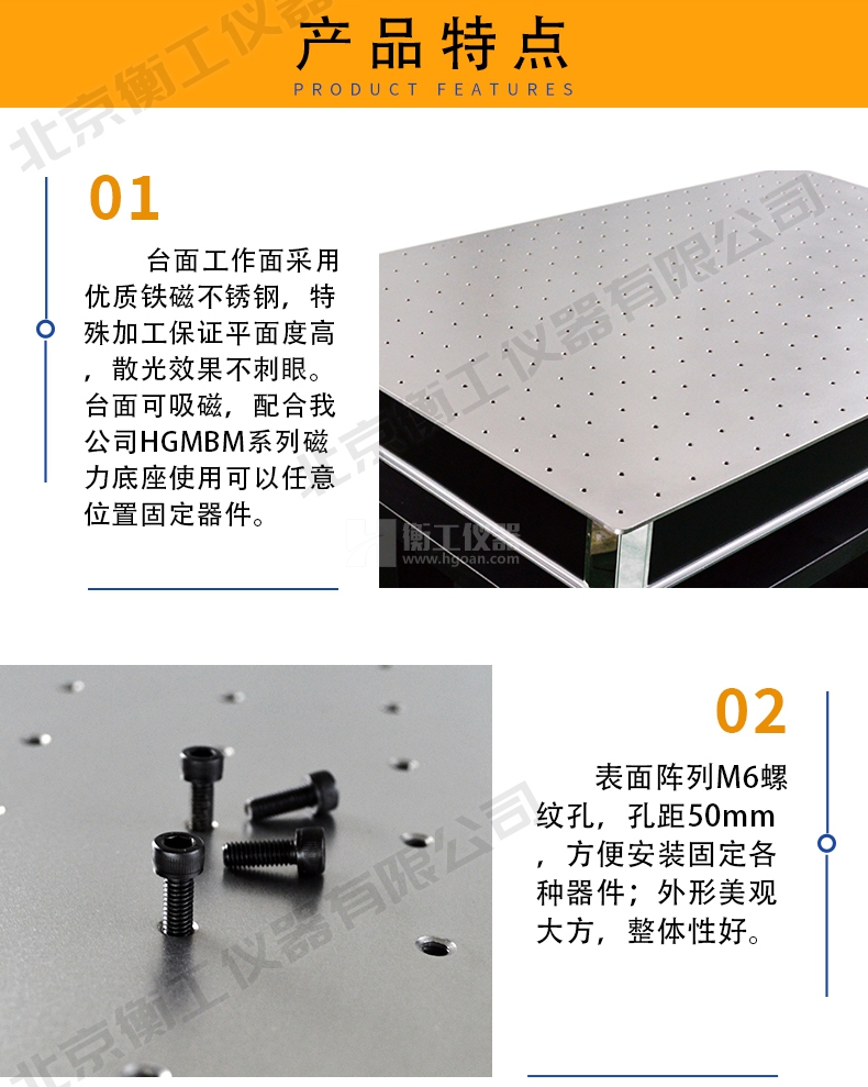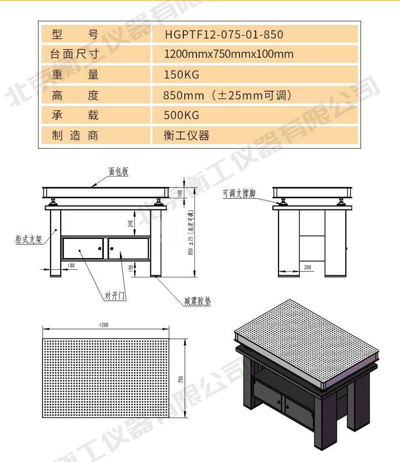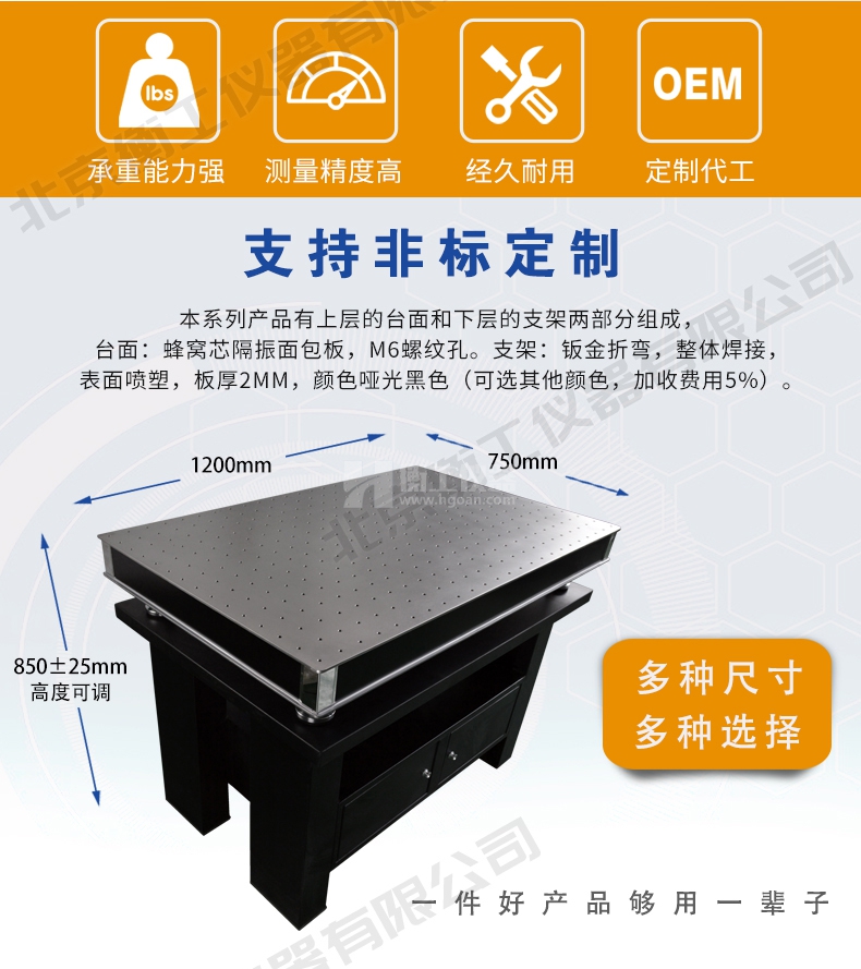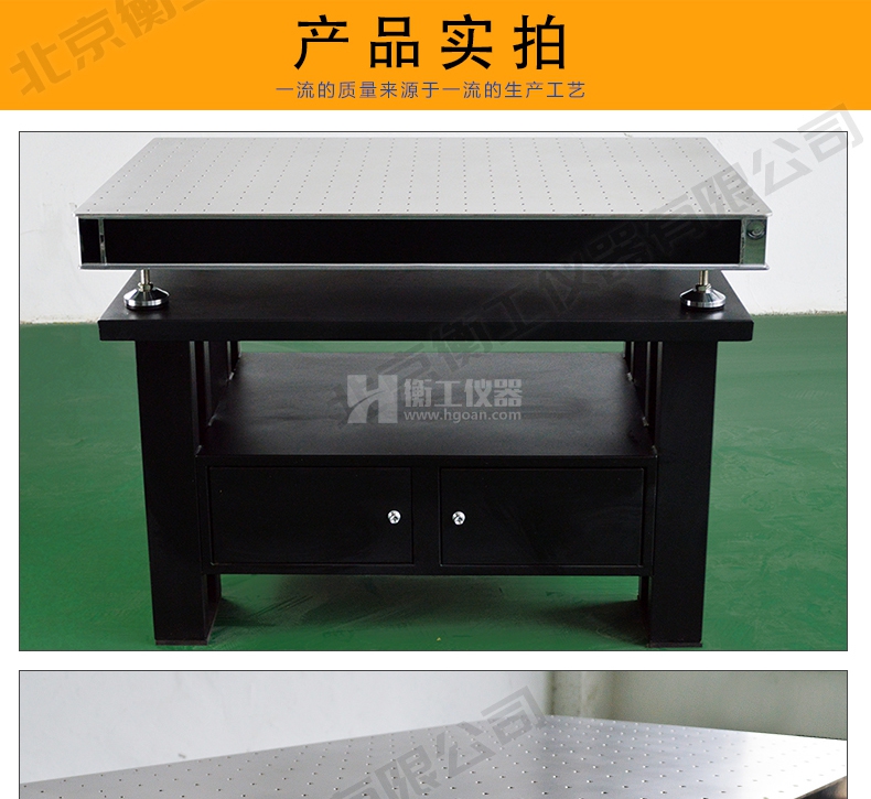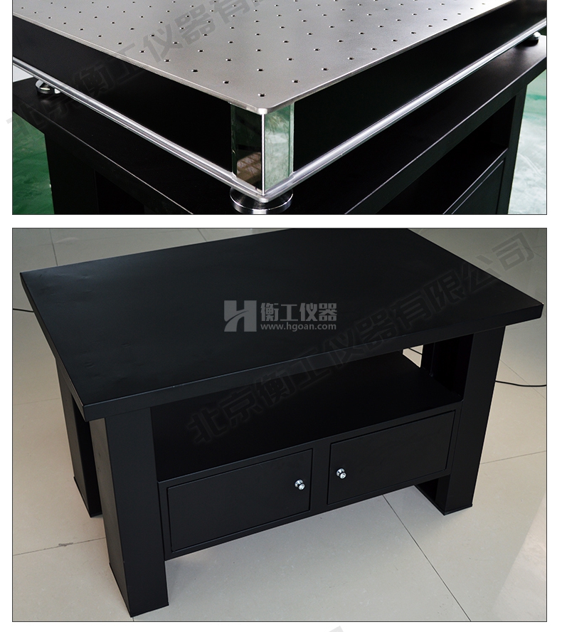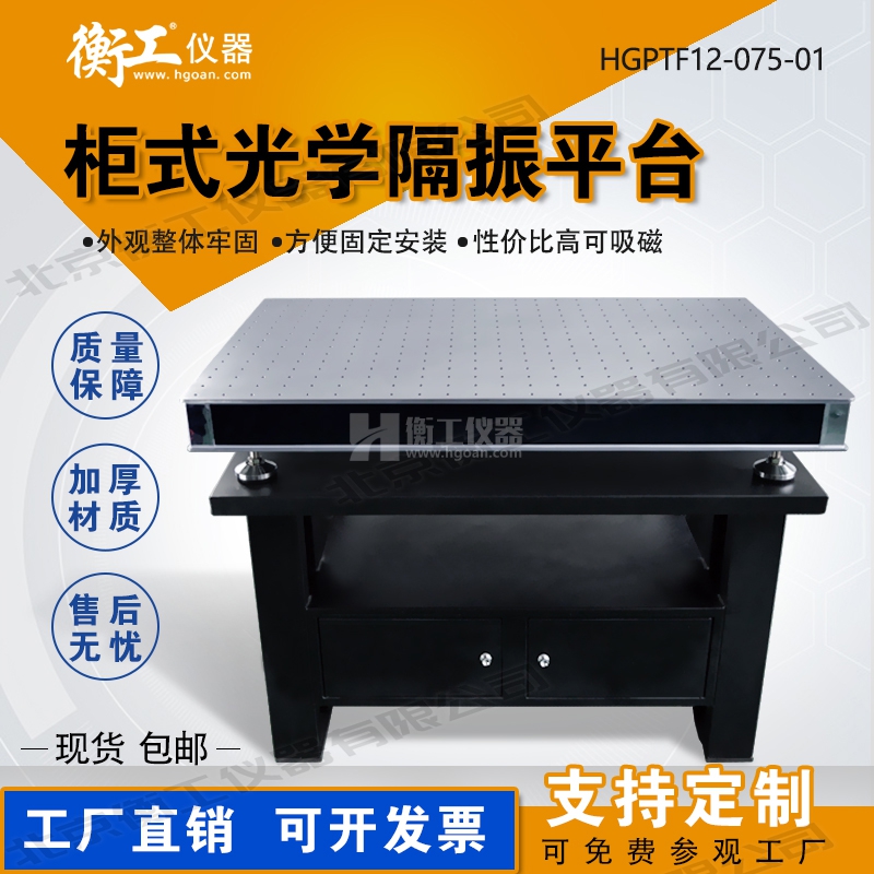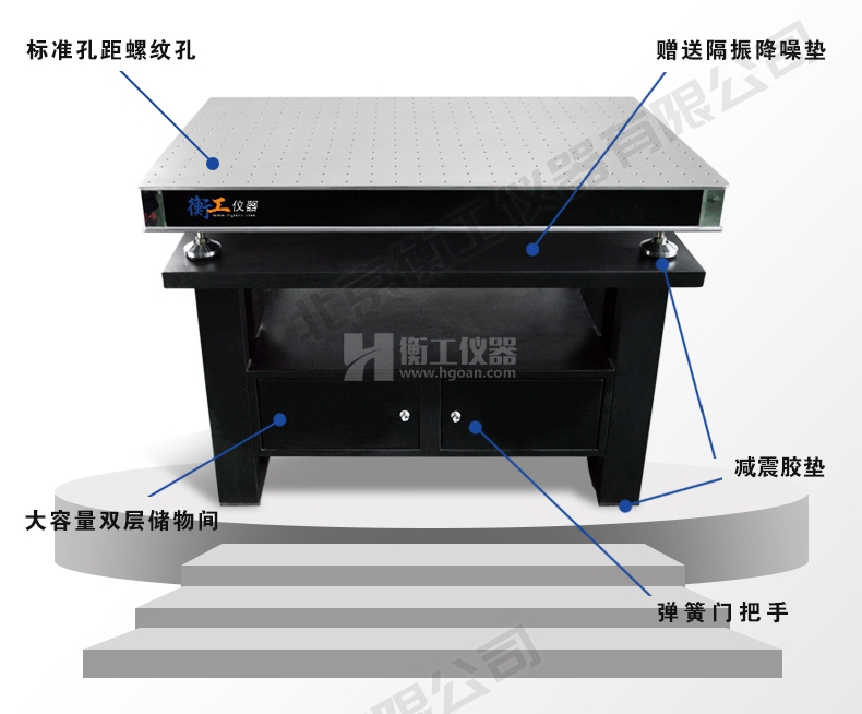 衡工儀器柜式光學隔振平臺,由上層臺面和下層支架兩部分組成,臺面采用蜂窩芯隔振面包板,m6螺紋孔支架采用鈑金折彎整體焊接技術